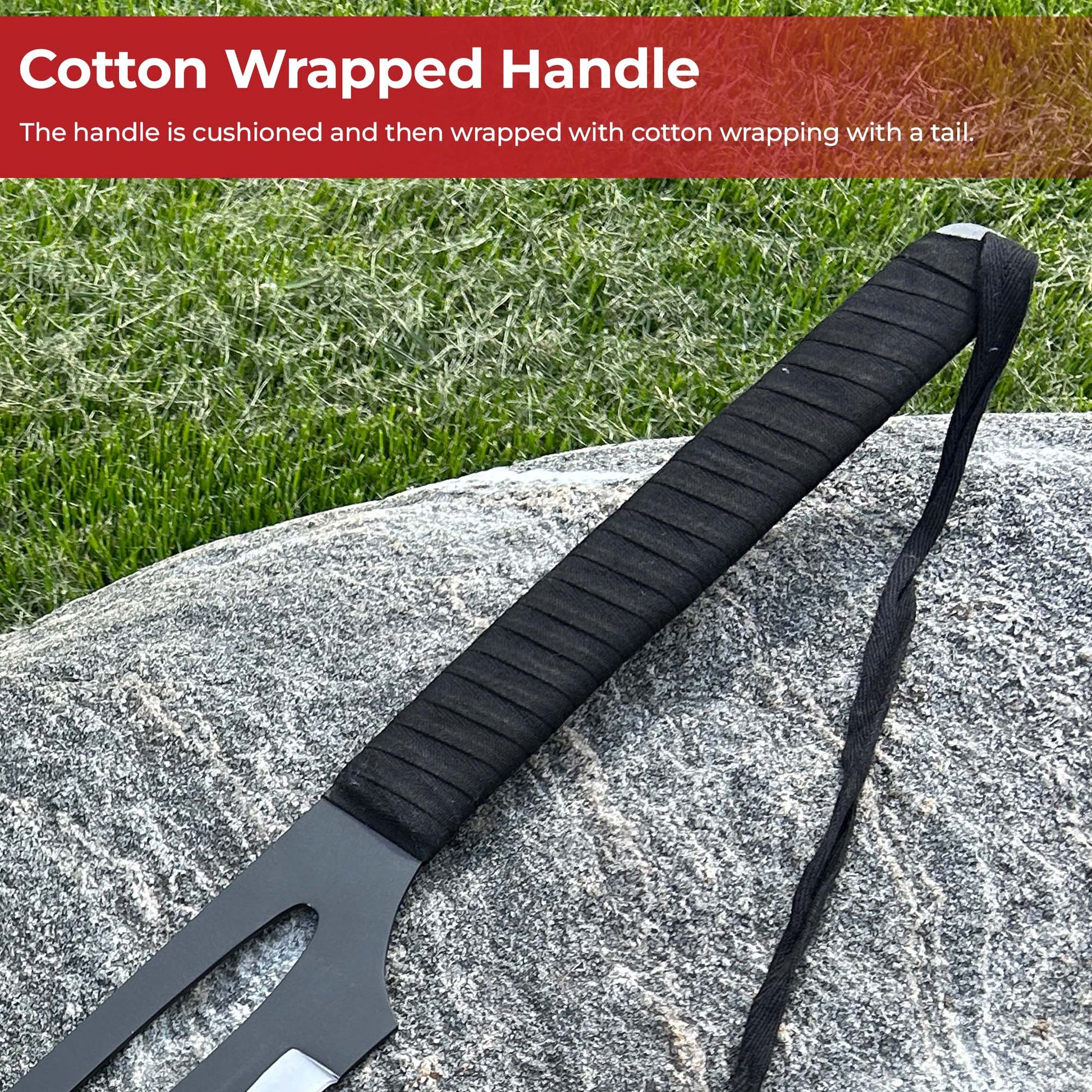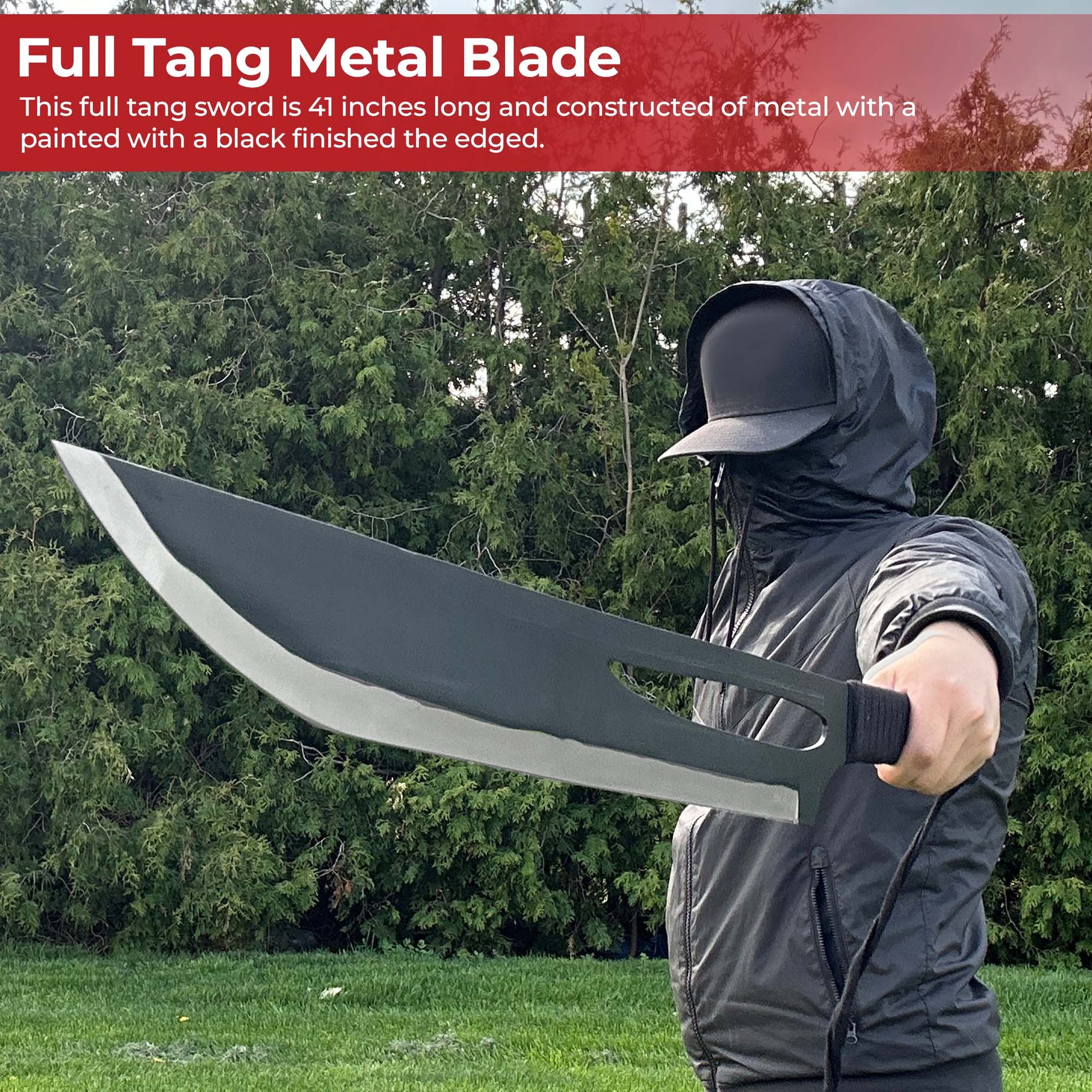 This 41 inch blade is wielded by Ichigo Kurosaki consequent to unleashing the dual blade form of his Zanpakuto, Tensa Zangetsu. This sword is usually carried with a short Zanpakuto allowing him in having two sources of power. This full tang sword is 41 inches long and constructed of stainless steel with a painted with a black finished the edged. There is an oblong cutout in the upper part of the blade allowing for a swift execution. The handle is cushioned and then wrapped with cotton wrapping with a tail. Included is a leather sheath with belt loop and back straps. This is an Ichigo Fans dream. Now you too can experience the dual power of Ichigo.