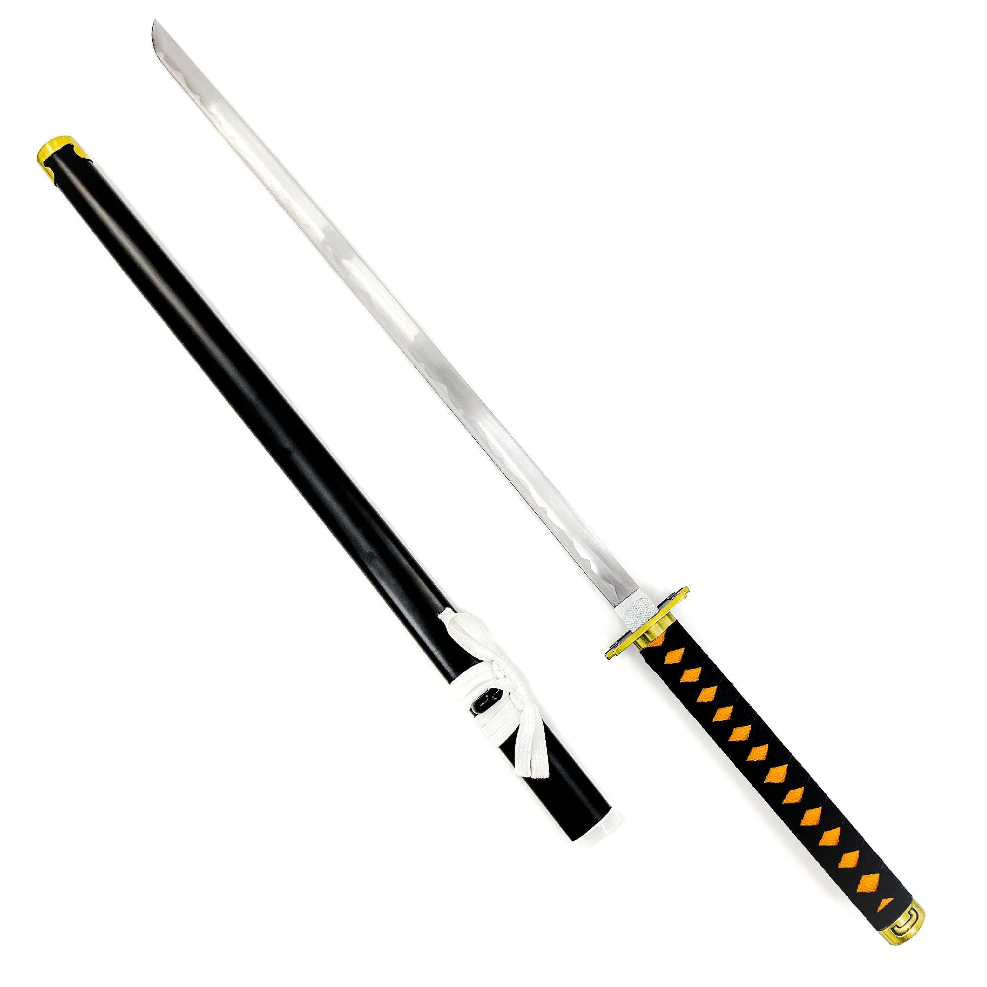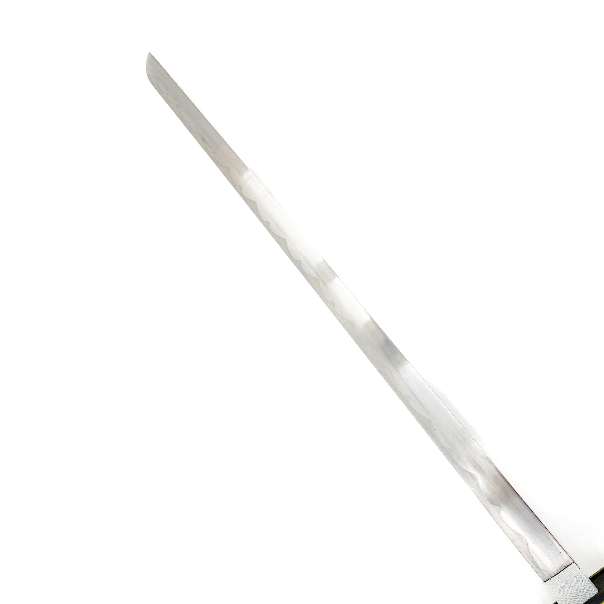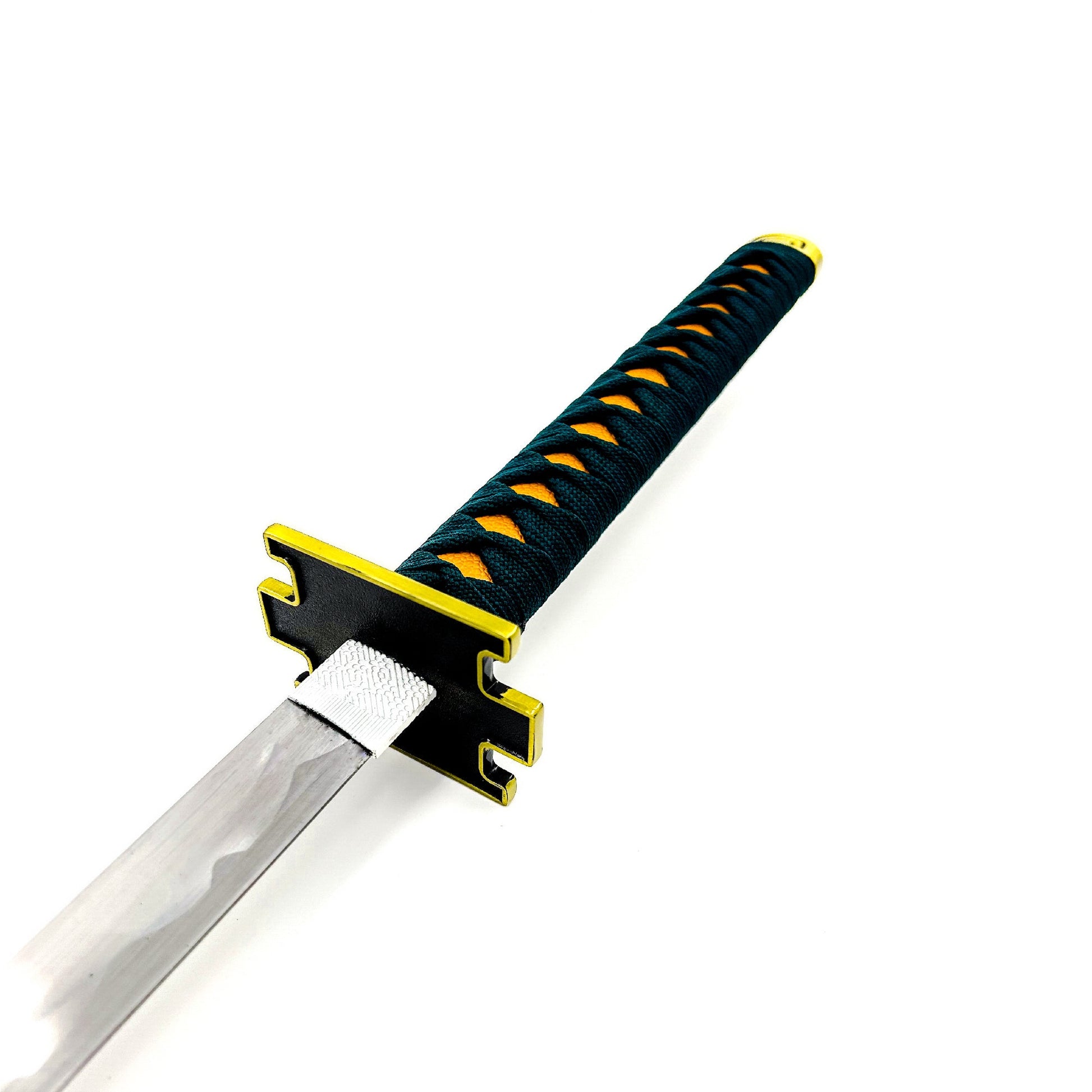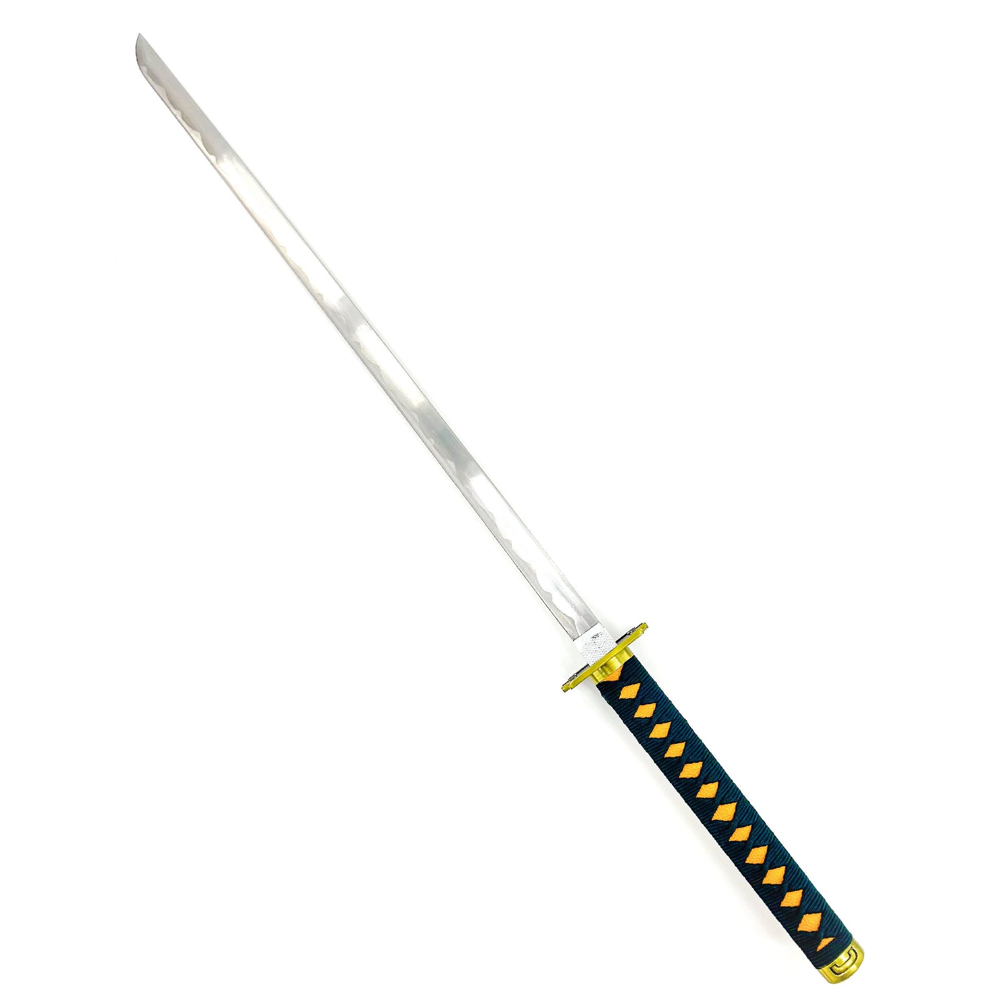 Step into the mystical world of Jujutsu Kaisen with our authentic replica of Yuta Okkotsu's iconic katana. This straight-edged masterpiece mirrors the one wielded by Yuta, featuring a meticulously crafted metal blade seamlessly connected to a metal guard with a striking symmetrical design. The attention to detail in this replica captures the essence of the anime's supernatural allure. The handle of the katana boasts a luxurious feel with yellow rayskin, expertly wrapped in dark green cotton and adorned with a polished metal endcap. Housed in a sleek, hard black scabbard, the sword is accentuated with a white cotton wrap and finished with exquisite metal fittings, offering both aesthetic appeal and durability. With a total length of 38.25 inches, this replica faithfully recreates the imposing presence of Yuta Okkotsu's signature weapon.