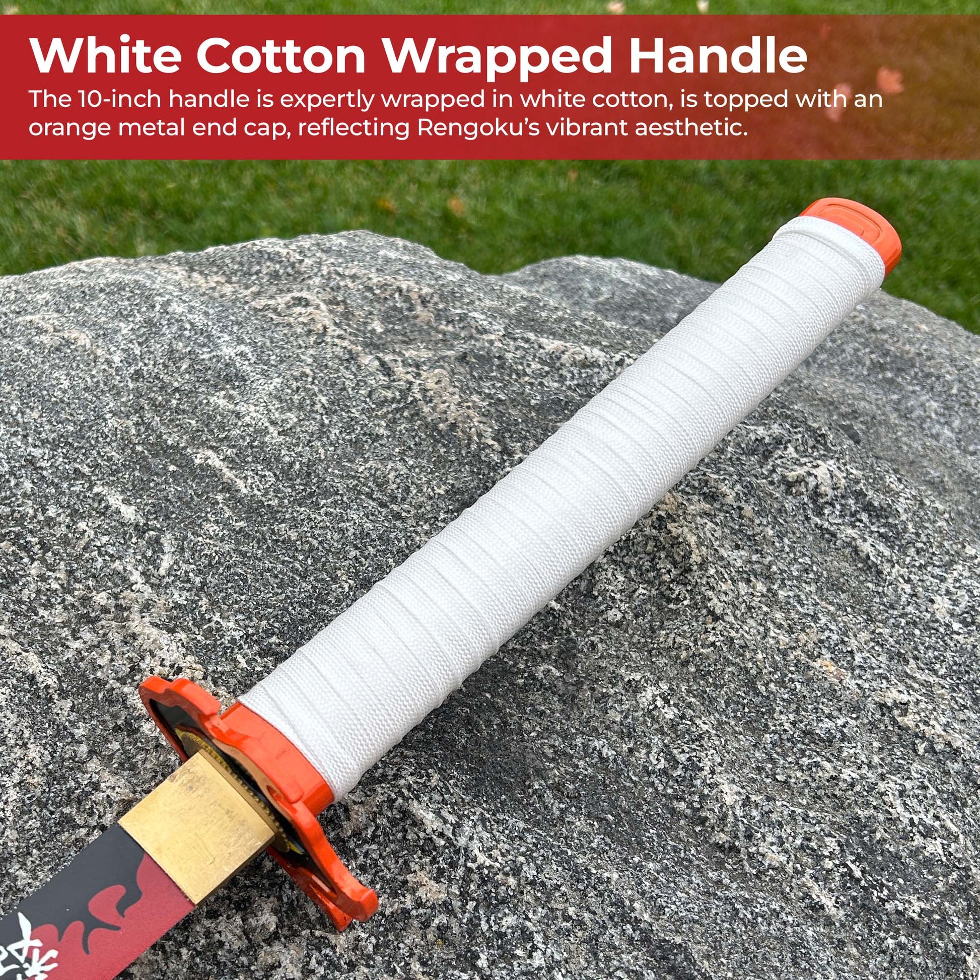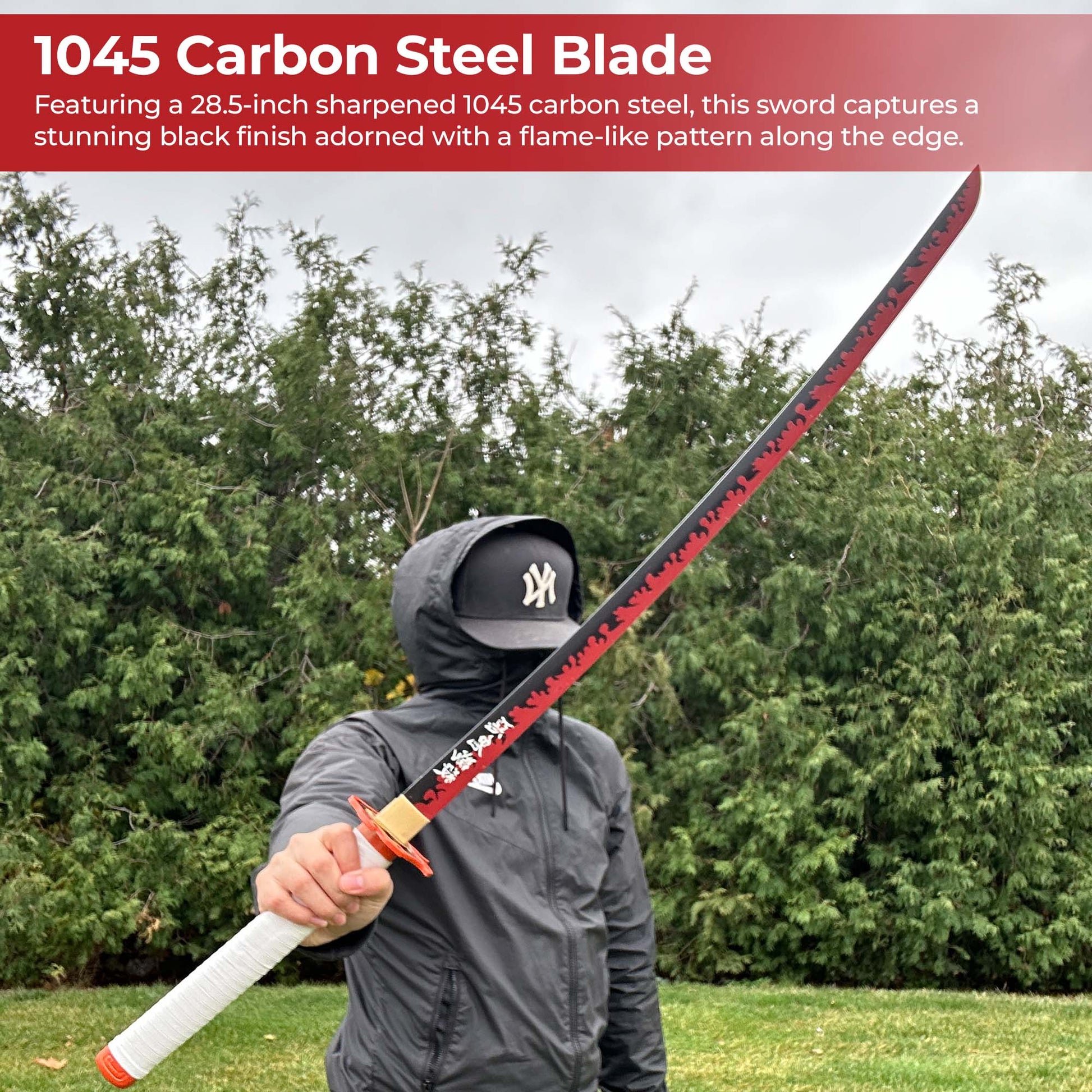 Ignite your collection with the Rengoku Blaze Demon Slayer Handmade Katana, a stunning replica inspired by Rengoku's iconic blade. This handcrafted masterpiece features a 28.5 inch carbon steel blade polished and adorned with a fiery red flame pattern that embodies Rengoku's blazing spirit. The hand-painted metal flame guard is a striking representation of the anime design, paired with a 10 inch handle wrapped in pure white cotton for a comfortable and secure grip. Topped with a meticulously designed metal end cap, this katana radiates elegance and power. Housed in a durable scabbard with intricate detailing, this blade is a fiery homage to Rengoku's strength and resolve, perfect for display in any collection.