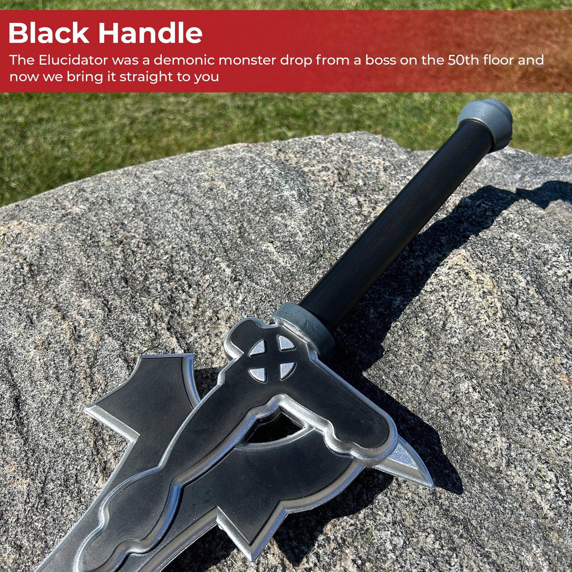 Replicated after the SOA Japanese series and game we now have the Kiritos Elucidator Sword. Kirigaya Kazuto known as Kirito is the main character in Sword Art Online. Due to his avatar wearing mostly all black he has been dubbed the Black Swordsman. Strapped to his back he wears two swords his Elucidator and then his Dark Repulser. The Elucidator was a demonic monster drop from a boss on the 50th floor and now we bring it straight to you. This piece is constructed of polyurethane foam with a 10mm inner core and is hand painted. The Elucidator is great for costumes and conventions. This sword is sure to be a treasure to any SAO fan. Don't wait act now!