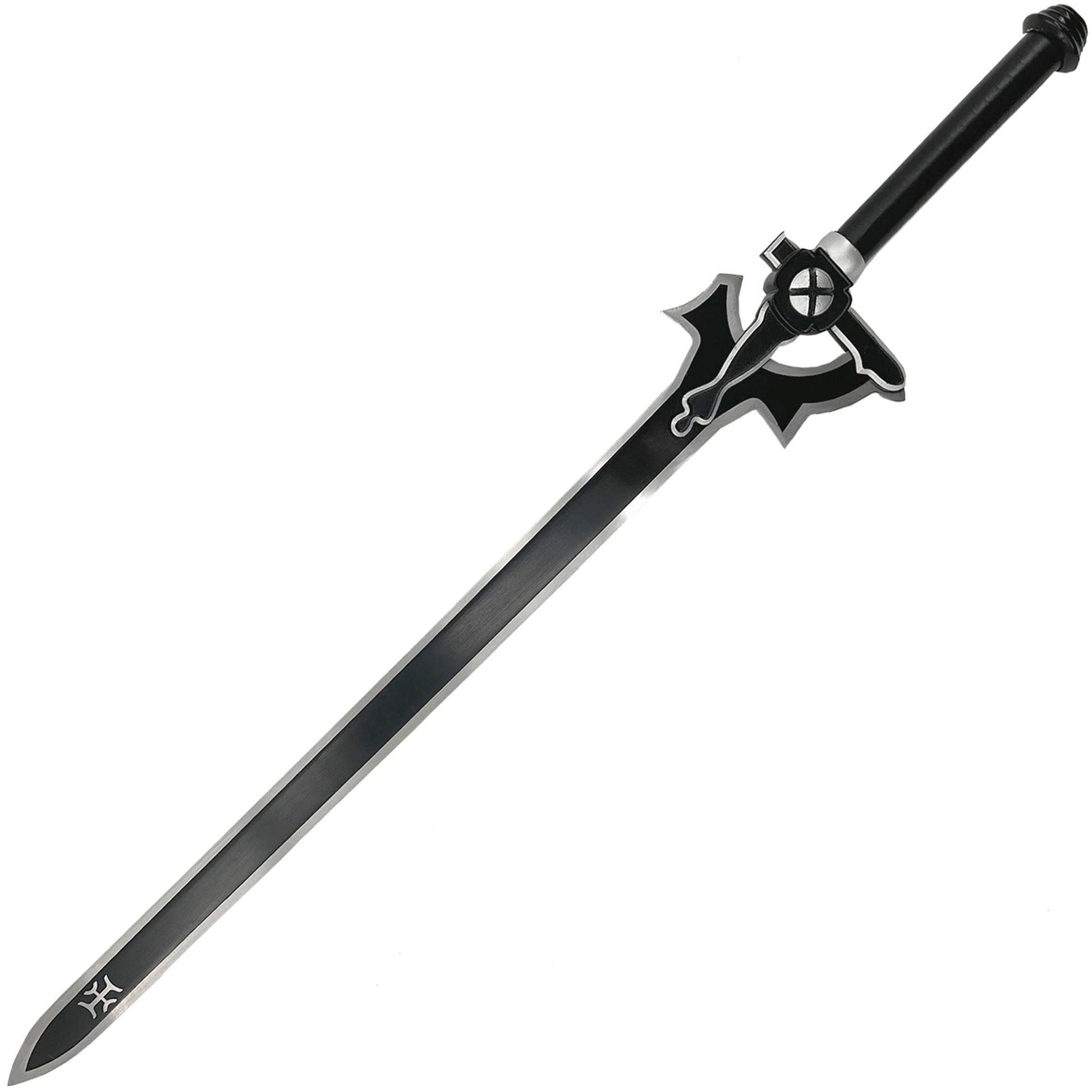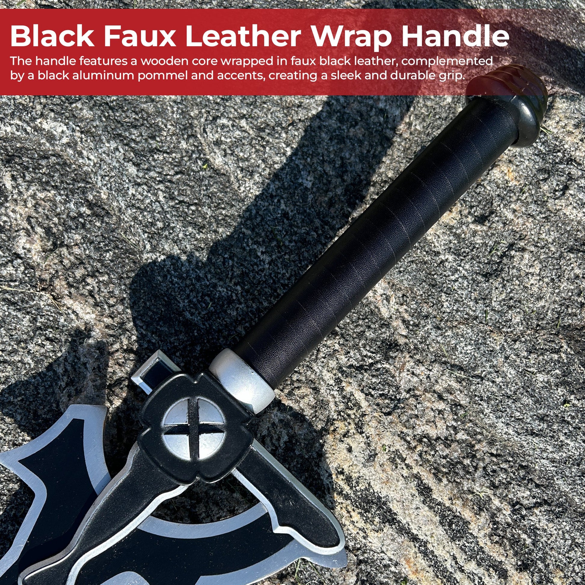 Replicated after the SOA Japanese series and game we now have the Kiritos Elucidator Sword. Kirigaya Kazuto known as Kirito is the main character in Sword Art Online. Due to his avatar wearing mostly all black he has been dubbed the Black Swordsman. Strapped to his back he wears two swords his Elucidator and then his Dark Repulser. The Elucidator was a demonic monster drop from a boss on the 50th floor and now we bring it straight to you. The wooden handle is wrapped in faux black leather with black aluminum pommel and accents. The blade has a black anodized finish with a satin steel edge. A small cross adorns the blade on both sides just above the tip. Included is a wooden scabbard with silver trim and two faux leather straps with plastic buckles. This piece is sure to be a treasure to any SAO fan. Dont wait act now!
