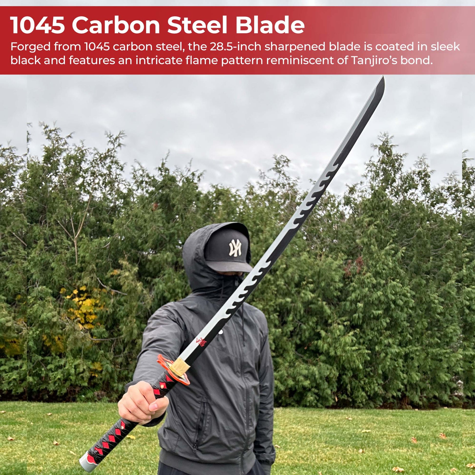 Overall Length: 41.5 inchesBlade: 28.5 inches; sharpened 1045 carbon steel with a sleek black finish and flame pattern