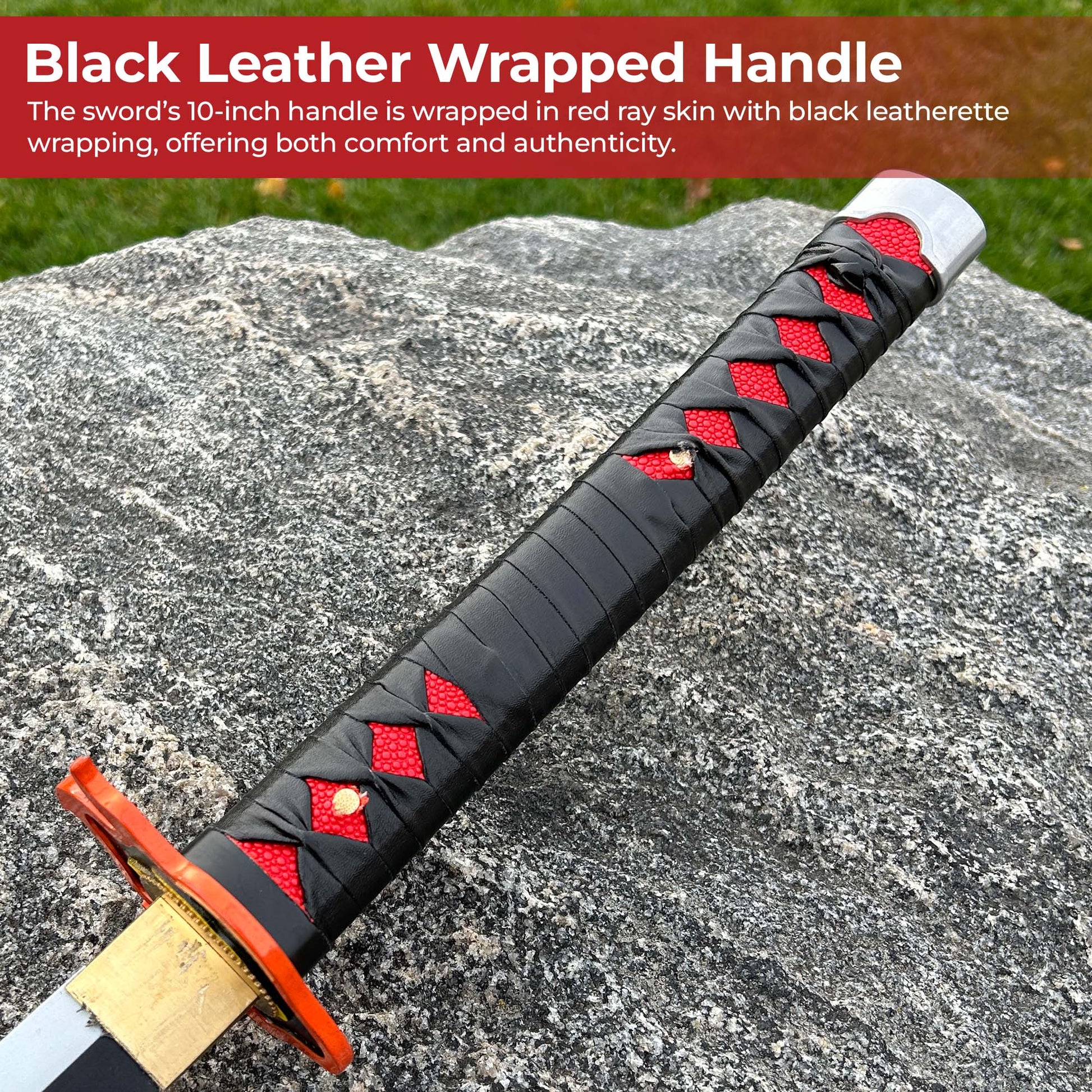 The Handmade Tanjiro Flame Sword is a stunning homage to the iconic weapon wielded by Tanjiro Kamado in Demon Slayer. Forged from 1045 carbon steel, the 28.5-inch sharpened blade is coated in sleek black and features an intricate flame pattern reminiscent of Tanjiro’s bond with Rengoku. The blade is paired with a metal flame guard, symbolizing the fiery strength and gratitude he received from the Flame Hashira. Measuring 41.5 inches overall, the sword’s 10-inch handle is wrapped in red ray skin with black leatherette wrapping, offering both comfort and authenticity. Housed in a durable black scabbard, this sword includes a black cotton protective bag and a desktop stand, making it perfect for display or as a collector's piece.